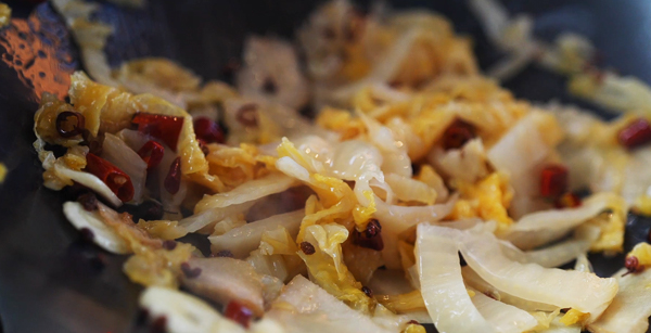 When the garlic, ginger, and pickled cabbage become fragrant, add the water. Add 1 teaspoon salt and 1.5 teaspoons Chinese soup stock to taste, and then cover and simmer.