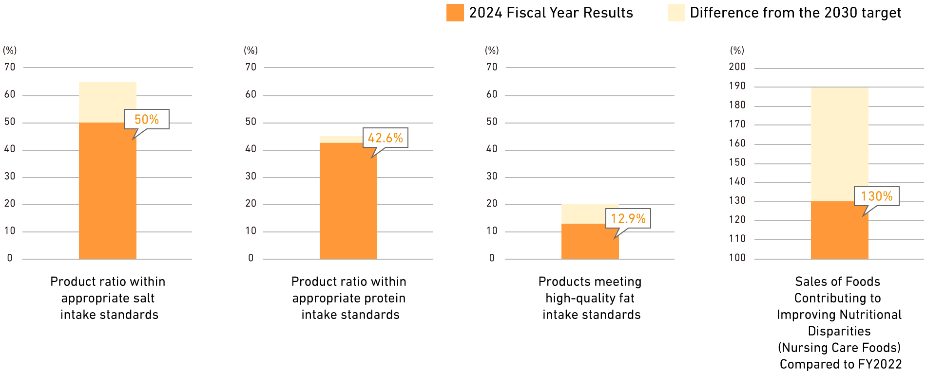 - We will establish internal standards related to nutrition for the following four nutritional challenges closely linked to Japan's health issues. By setting sales ratio targets for products meeting these standards and expanding their sales, we will contribute to solving these challenges.