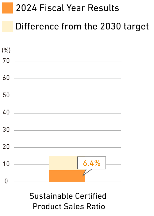 Seafood products circulating globally are considered to carry numerous risks, including depletion of wild fisheries resources, environmental damage from aquaculture, and involvement in IUU fishing. In addition to addressing these risks, we have decided to actively promote the handling of seafood produced by sustainable fisheries and aquaculture operations holding internationally recognized certifications approved by the Global Sustainable Seafood Initiative (GSSI). This initiative is part of our value proposition for “sustainability-conscious food,” with specific KPIs established. Similar to health value creation, we will advance this initiative by setting the sales ratio of certified products as a KPI relative to total sales.